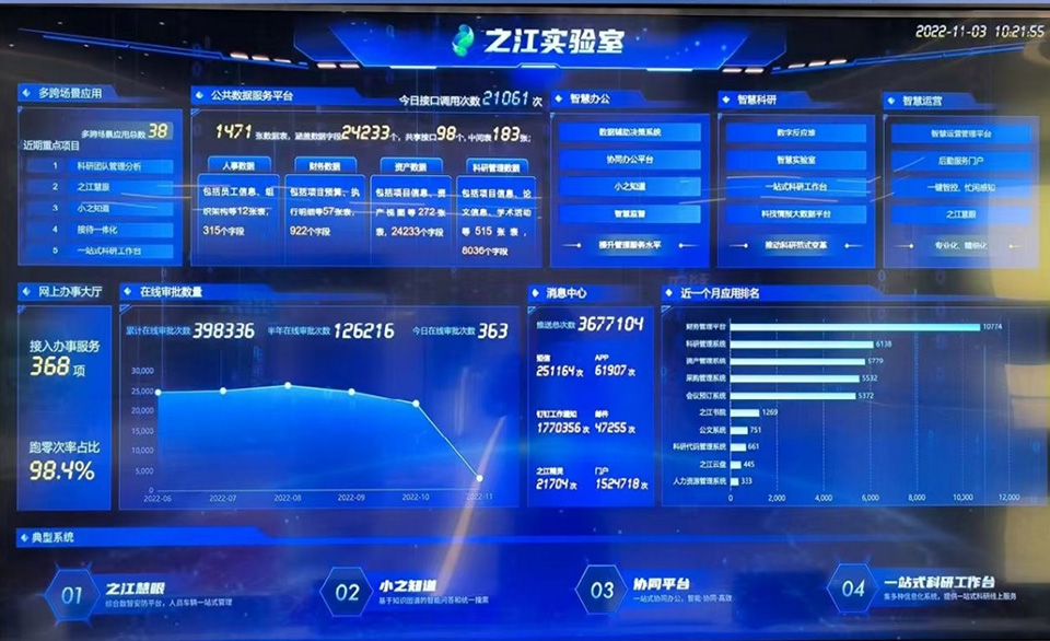 • 之江實驗室智慧園區以“園區+互聯網”為理念,建立感知層、網絡層、平臺層、應用層的架構體系,融入大數據和云計算,構建成為數字化、可視化的超腦平臺。智慧園區函蓋辦公、環境、生活等方方面面,所有在園區內和即